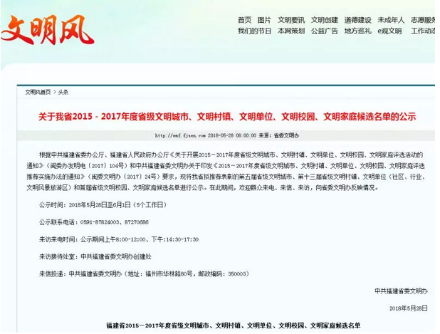 福建省2015-2017年度省级文明城市、