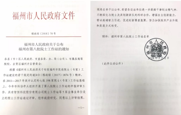 近日,福州市人民政府印发了关于福州市第八批院士工作站的通知,麻豆av 内企业智恒科技股份有限公司设立的院士工作站通过评审,成功入选。具体文件内容如下: