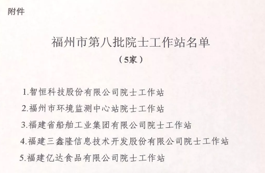 根据《福州市人民政府关于印发福州市促进院士(专家)工作站建设的若干规定的通知》(榕政综【2017】1874号)精神,在2011-2017年我市认定的七批198家院士(专家)工作站基础上,今年市科协牵头组织开展了第八批院士工作站的申报评审工作,共有智恒科技股份有限公司院士工作站等5家企事业单位设立的院士工作站通过评审。经市政府研究,同意以上评审结果,现将名单予以公布。希望各设站单位进一步提振干事创业精气神,不断深化与院士及其创新团队的科研合作,增强自主创新能力,带动高端智力引进,促进创新要素聚集,努力加快我市产业升级和发展方式转变。