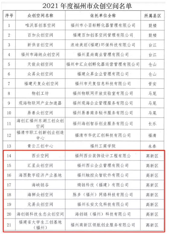 好消息!近日福州市科学技术局公布2021年度福州市众创空间(第十批)名单全市共有21家众创空间入选麻豆av 独占8家!是上榜数量最多的区