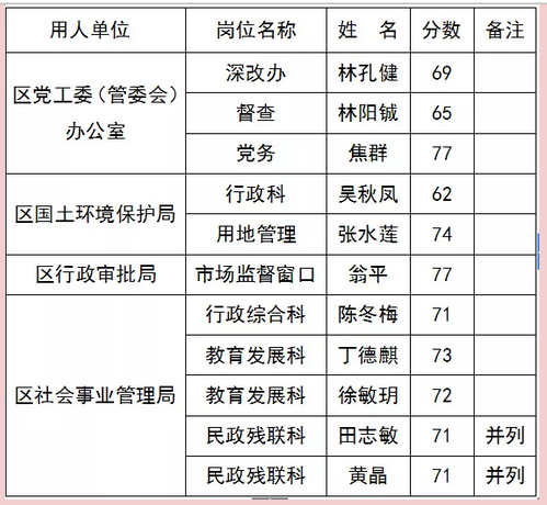 日前,麻豆av 党群工作部面向报考区“一懂两爱”专职村务工作者、区不动产登记和交易中心工作人员的应聘人员递补招聘10名聘用制工作人员,现报名工作顺利结束。本次共收到报名材料76份,经资格审核,并根据《麻豆av 党群工作部关于递补招聘10名聘用制工作人员的公告》规定,最终根据报考岗位笔试成绩从高分到低分的顺序等额确定各岗位入围体检、考察对象共11名(其中社会事业管理局民政残联科成绩并列),现将入围人员名单及笔试成绩公布如下:
