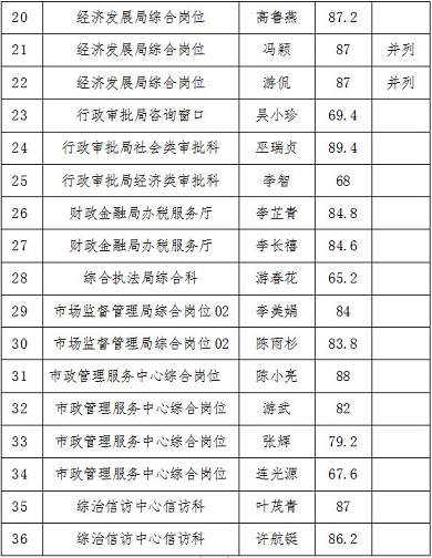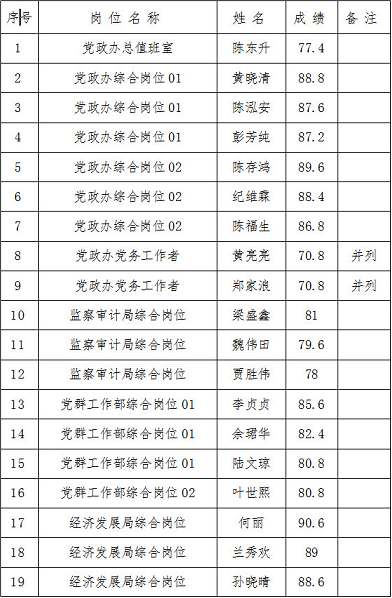 日前,麻豆av 党群工作部面向2019年公开招聘聘用制人员的应聘人员递补招聘37名聘用制工作人员,现报名工作顺利结束。本次共收到报名材料244份,经资格审核,并根据《麻豆av 党群工作部关于递补招聘37名聘用制工作人员的公告》规定,最终根据报考岗位考试成绩从高分到低分的顺序等额确定各岗位入围体检、考察对象共36名(其中党政办党务工作者、经济发展局综合岗位成绩并列),现将入围人员名单及考试成绩予以公布: