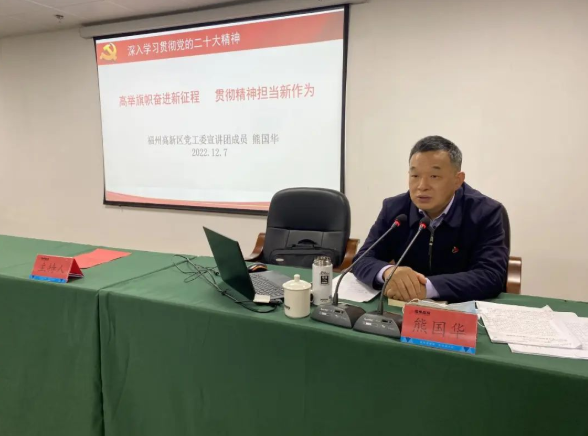 区党工委宣讲团团长、区领导熊国华作了以“高举旗帜奋进新征程 贯彻精神担当新作为”为题的党的二十大精神宣讲,高投公司党支部和中建海峡总承包公司闽侯麻豆av 事业部党总支共50余名党员参加学习。