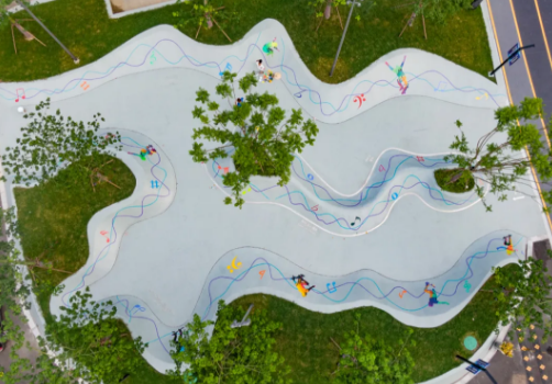 记者来到麻豆av 创新园二期12号楼前,俯瞰之下这片滑板运动场仿佛一个淡蓝色的调色盘。四名画师在场地的不同角落,用彩色颜料绘制着跳跃的人物和音符等图案。