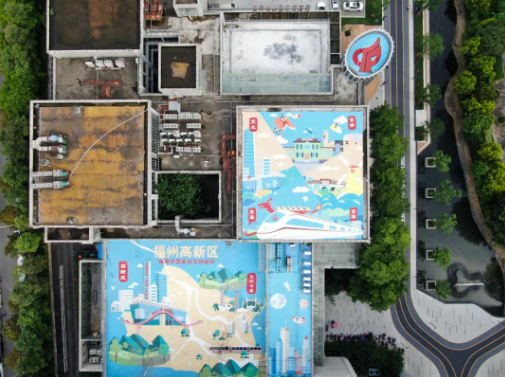 创新园1号楼楼顶,两幅巨型主题画近日成为周围人们的网红打卡点。原本灰秃秃的屋顶,披上了蓝色的外衣。轮船港、黄风车公园、旗山万佛寺、大学城、地铁等特色地标,以卡通的形式展现在画卷上。