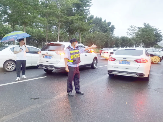 ▲协警疏导家长接送车辆,停靠在旗山大道旁
